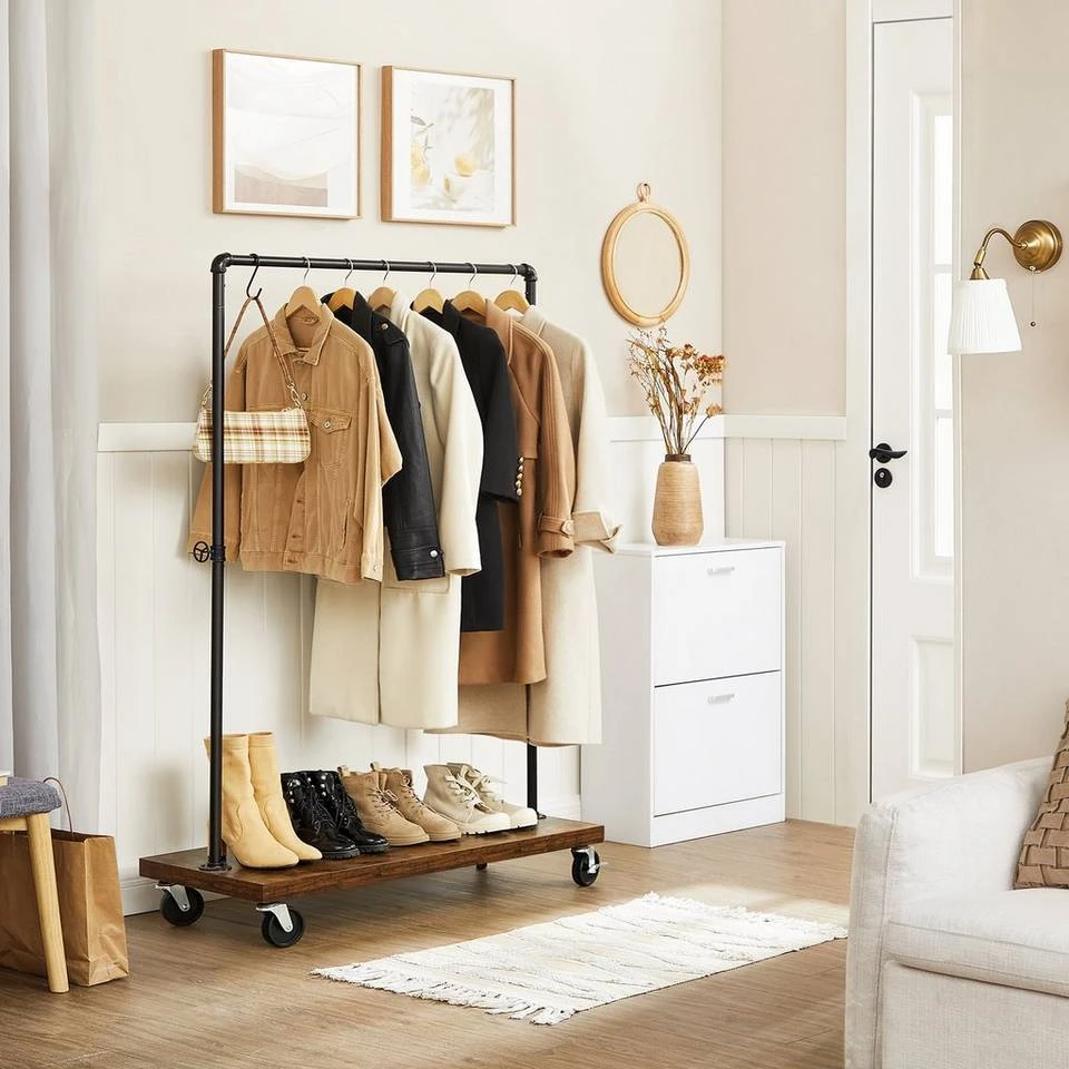 Dieser Garderobenständer vereint eine Kleiderstange und eine Schuhablage in sich. So können Ihre Kleidungsstücke sowie Schuhe an einem Platz gemeinsam aufbewahrt werden, was einen einfachen Zugriff ermöglicht, wenn Sie ein Outfit auswählen. Hängen Sie Ihre Jacken oder Hemden faltenfrei an diese Kleiderstange auf, sodass Sie sie nicht mehr mühsam zusammenlegen und bügeln müssen. Auf die Ablage im unteren Bereich passen einige Boxen, in denen Sie Schals, Socken oder viele weitere Accessoires verstauen können.