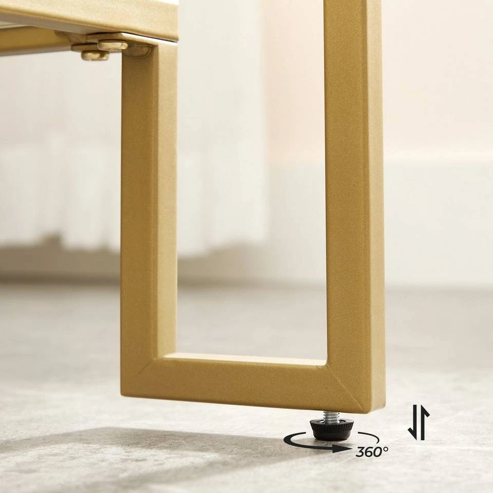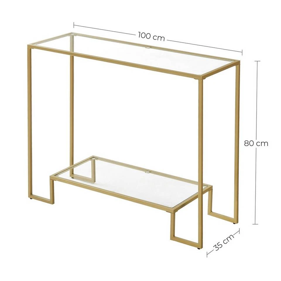 - Einen Konsolentisch mit 2 Glasablagen und goldenem Metallgestell sowie die Möglichkeit, Ihren Flur, Ihr Wohnzimmer oder Ihr Schlafzimmer zum Glänzen zu bringen