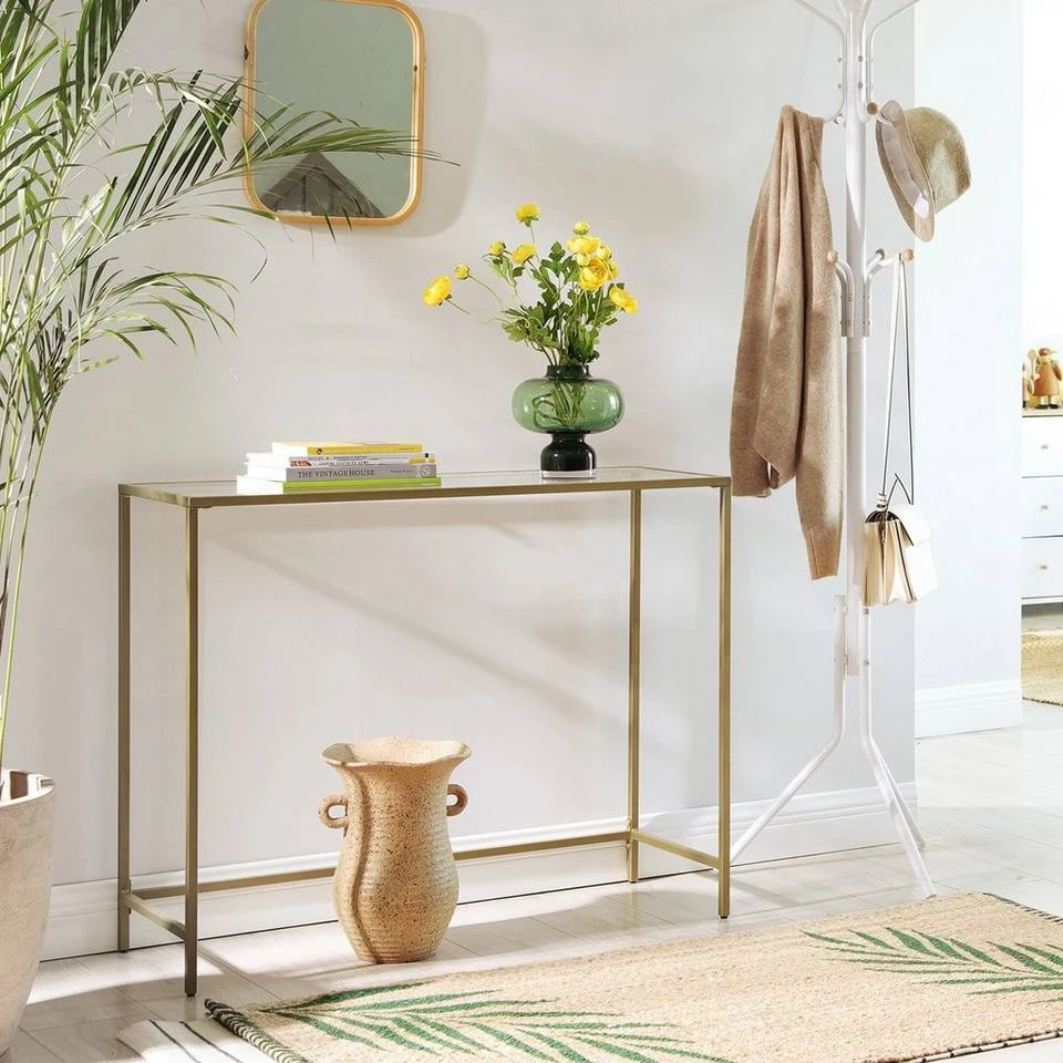 - Transparente Stabilität: Die 6 mm dicke Hartglasplatte sitzt fest auf dem stabilen Metallgestell dieser 100 x 35 x 80 cm großen Konsole, die mit bis zu 30 kg belastbar