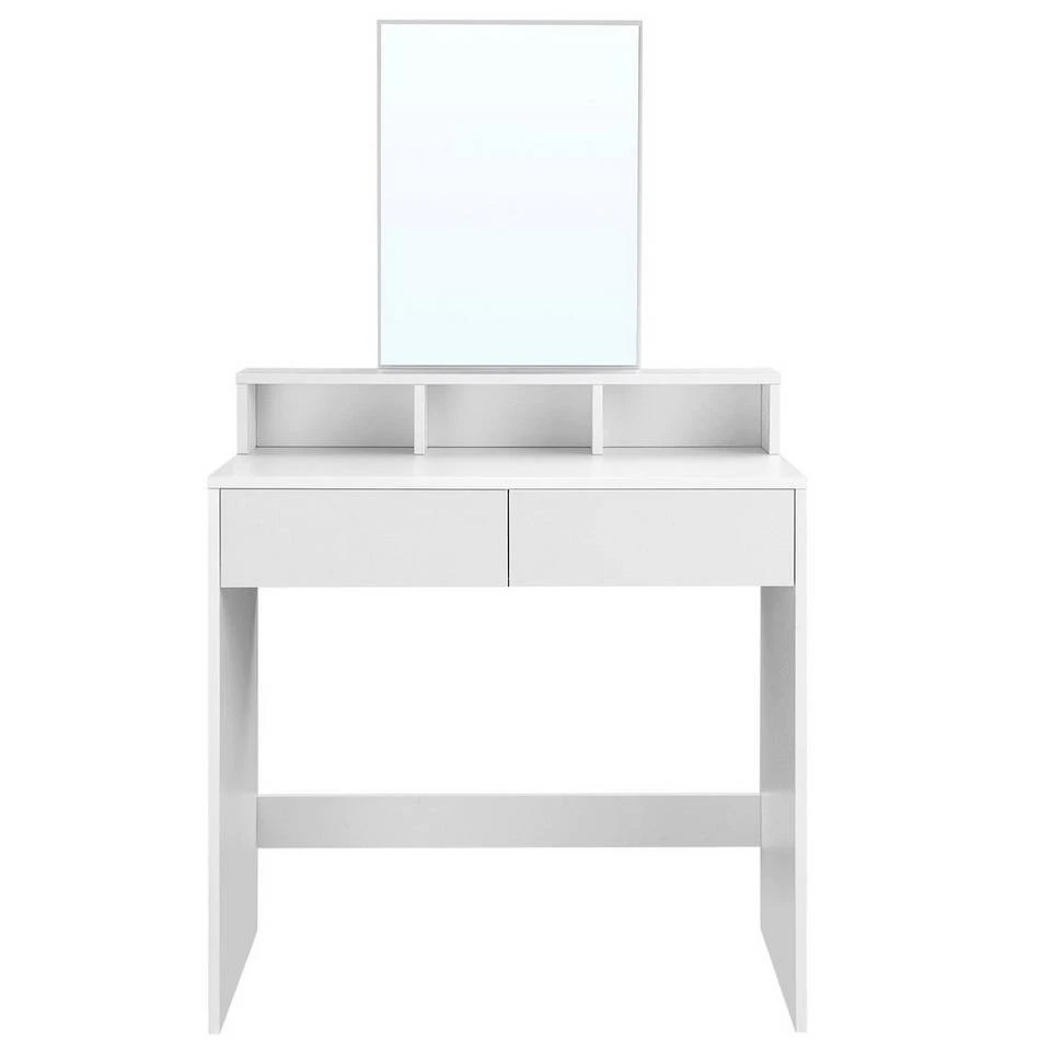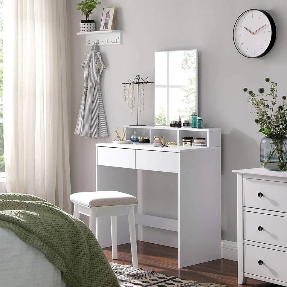 - WAS SIE BEKOMMEN? Einen Frisiertisch mit 2 Schubladen, 3 offenen Fächern und einem großen Spiegel, in dem Sie sich täglich bewundern können. Sie erhalten zudem einen Kippschutz