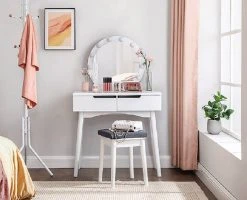 - Damit kein Chaos aus Cremes, Kosmetika sowie Schmuck entsteht, verfügt dieser Schminktisch über eine große Tischoberfläche sowie 2 geräumige Schubladen auf Schienen