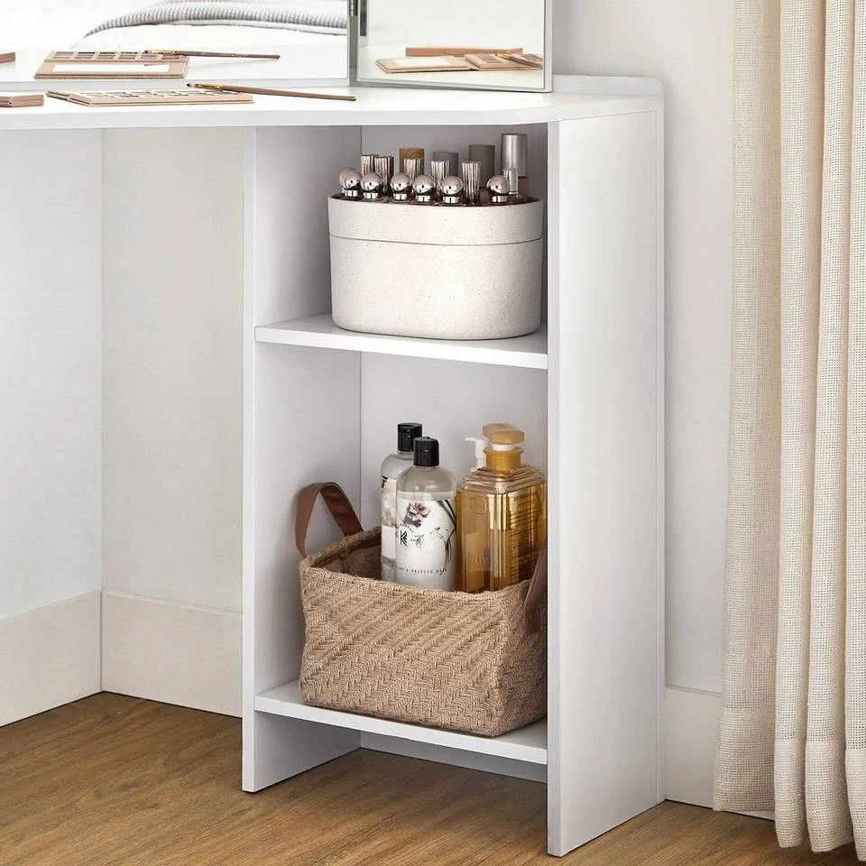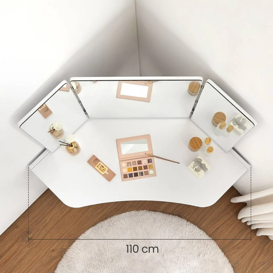 Dieser 90-Grad-Eckschminktisch passt in jede Ecke Ihres Zimmers. Setzen Sie sich hin – Unter dem Tisch gibt es viel Beinfreiheit!