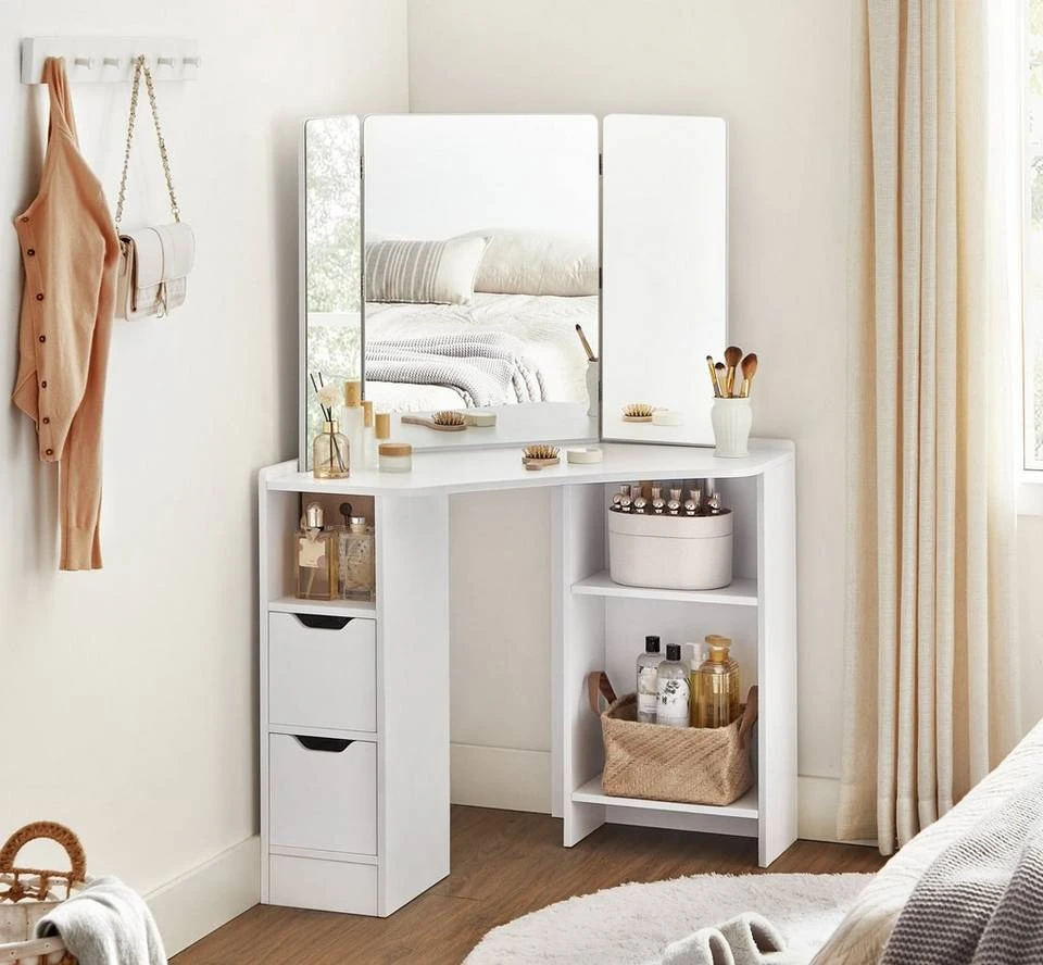 - In Ihrem Zimmer zählt jeder Zentimeter, ignorieren Sie also nicht die leere Ecke – Dieser Eckschminktisch mit seinem einzigartigen Design passt dort wunderbar hin