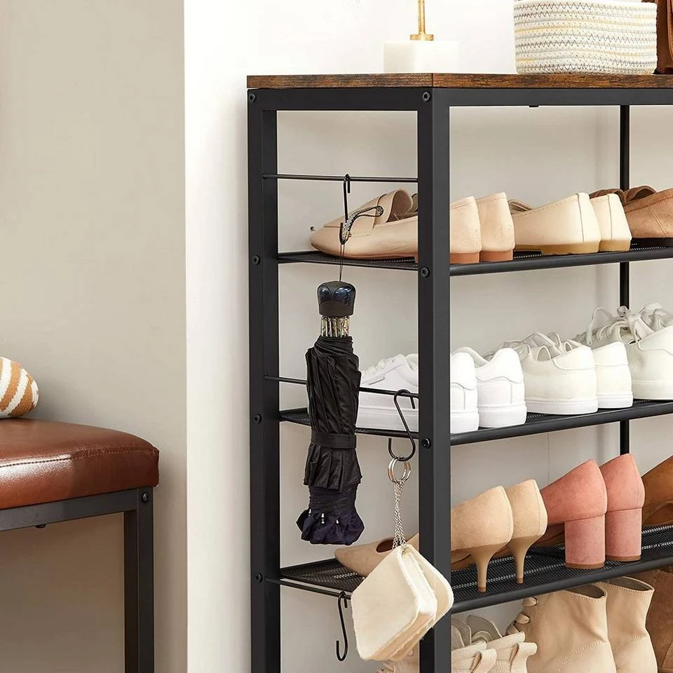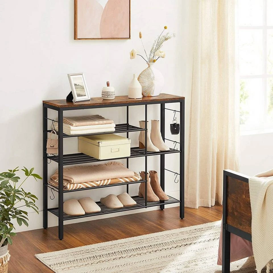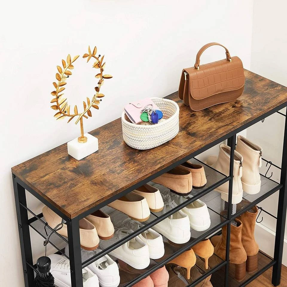 - Ein charmantes Zuhause für Ihre Schuhe: Ein schwarzes Stahlgestell, eine vintagebraune Spanplatte und Gitterablagen