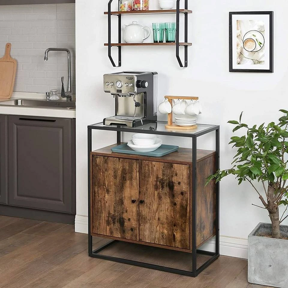 - Stellen Sie eine Blumenvase auf die Glasoberfläche, legen Sie Bücher auf die Ablage und verstauen Sie Geschirr auf den 3 höhenverstellbaren Regalebenen im Inneren des Schranks