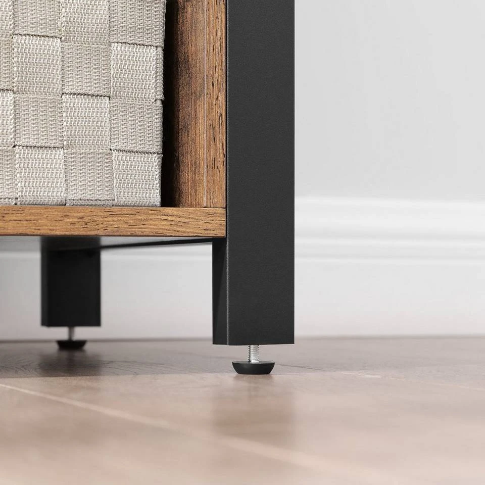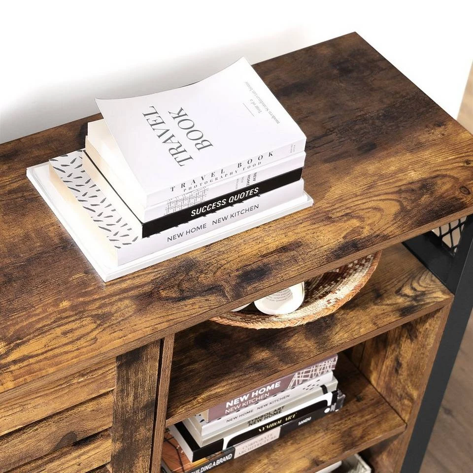 - Vintagebraune Oberfläche mit Holzmaserung, schwarzem Metallgestell, Gitter und Lamellentüren – Dieses Möbelstück verkörpert den Industriestil